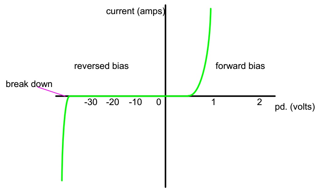=> the p-type material becoming negatively charged (because it has gained electrons). => the n-type material becoming positively charged (because it has lost electrons). => the negative charge of the p-type repels any further electrons from moving across the boundary. A region is left around the boundary where there are no holes or electrons, i.e. no free charge carriers. This region is known as the Depletion Layer and is an insulator, i.e. no current can flow. What if a PD is put across the p-n junction, with connecting lead A negative with respect to connecting lead B? In this state, the p-n junction is said to be reversed biased. What will happen if the PD continues to increase? The maximum PD that can be put across a p-n junction depends on how it is made - a few volts up to many kilovolts. What if a PD is put across the p-n junction, with connecting lead A positive with respect to connecting lead B? If the pd. is increased, the depletion layer will eventually disappear, current can freely pass through the junction. For silicon, the PD needed is around 0.7V. In this state, the p-n junction is said to be forward biased. A p-n junction used in this way forms a device called a Diode. The symbol for a diode is