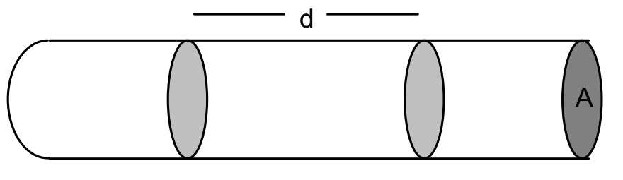 In a conductor, the number of conduction electrons is large. Copper metal atoms have one outer electron that can move around. One mole of copper atoms has a mass of 6.35 × 10-2kg. The density of copper is 8.9 × 103kgm-3. Show that in one m3 there are ≈ 8.44 × 1028 conduction electrons. The conduction electrons move very quickly. Their speed can be estimated by equating their kinetic energy to their thermal energy. => ½mv2 = kT where k is the Boltzmann constant,T is the absolute temperature, m is the mass of an electron, v is the velocity of an electron. Show that the approximate velocity is 105ms-1. However, the speed that the conduction electrons drift along a conductor is low. If a potential difference is put across the metal then the conduction electrons will drift along the wire from the negative side and towards the positive side. Consider a length, d, of wire of cross-sectional area, A, made from a metal with n freely moving conduction electrons per cubic metre.