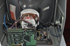 The inside of a small colour television.